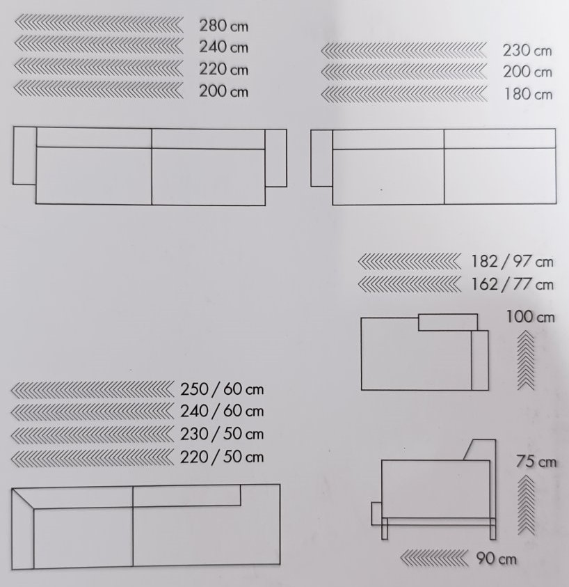 Παράγεται σε διθέσιο, ενδιάμεσο, τριθέσιο, max τριθέσιο καναπέ και σε γωνιακό καναπέ διαφόρων διαστάσεων.