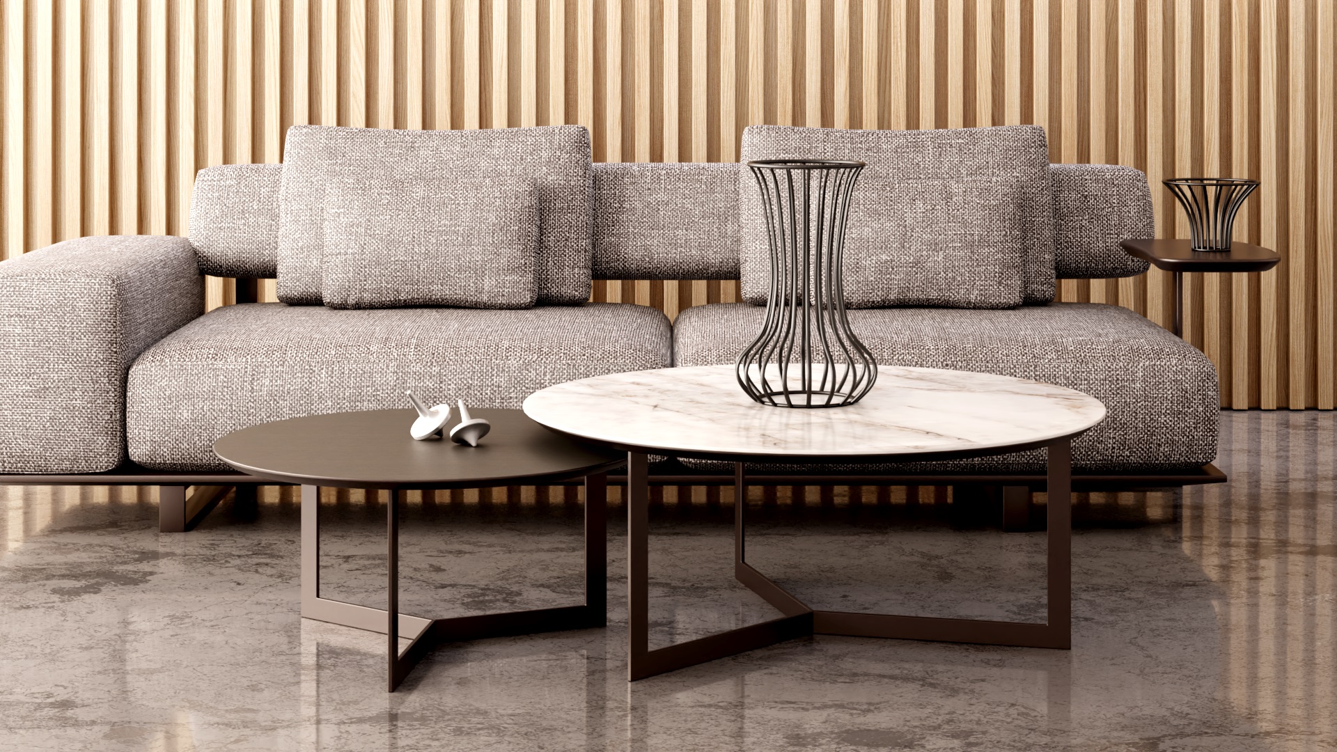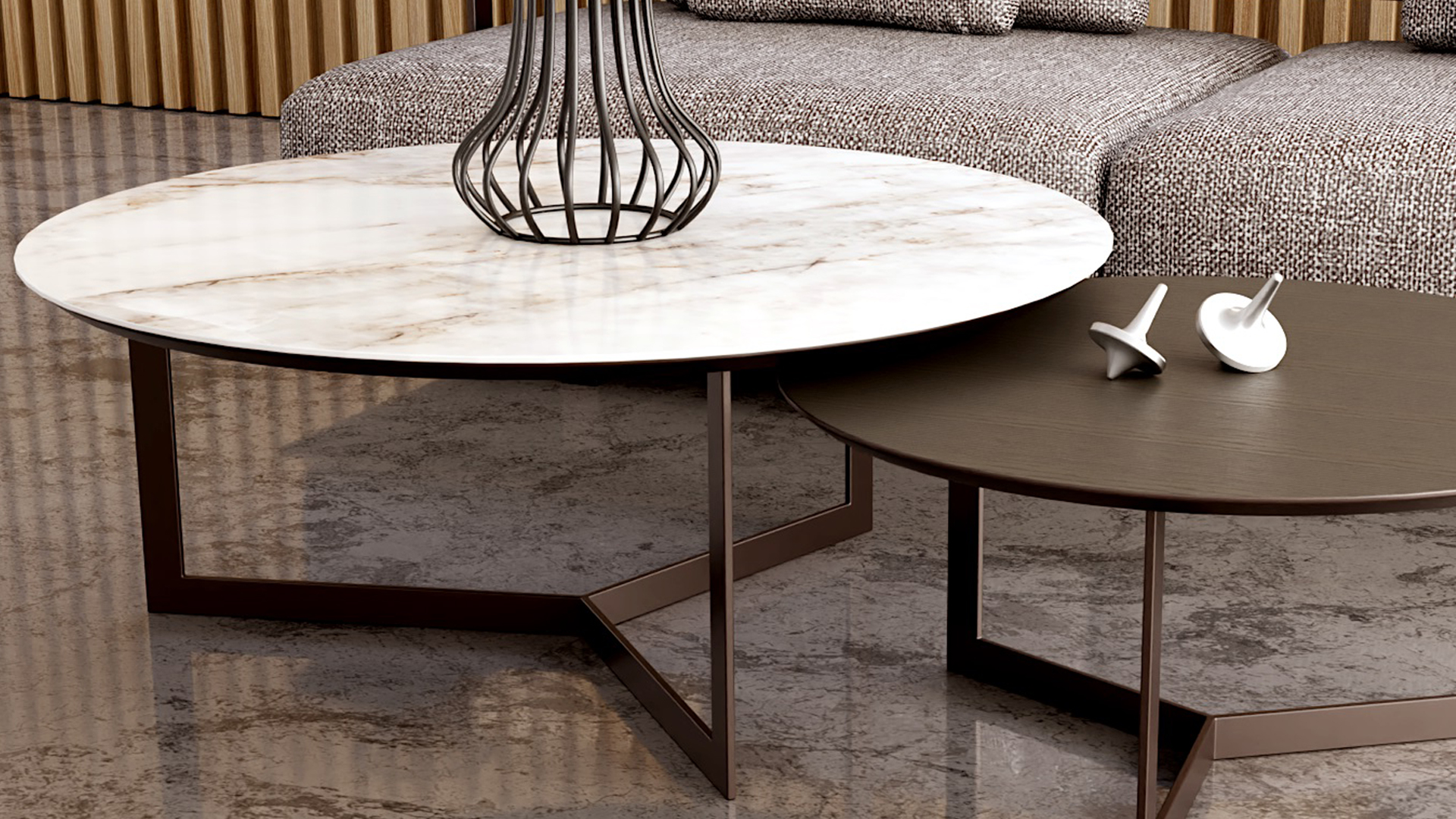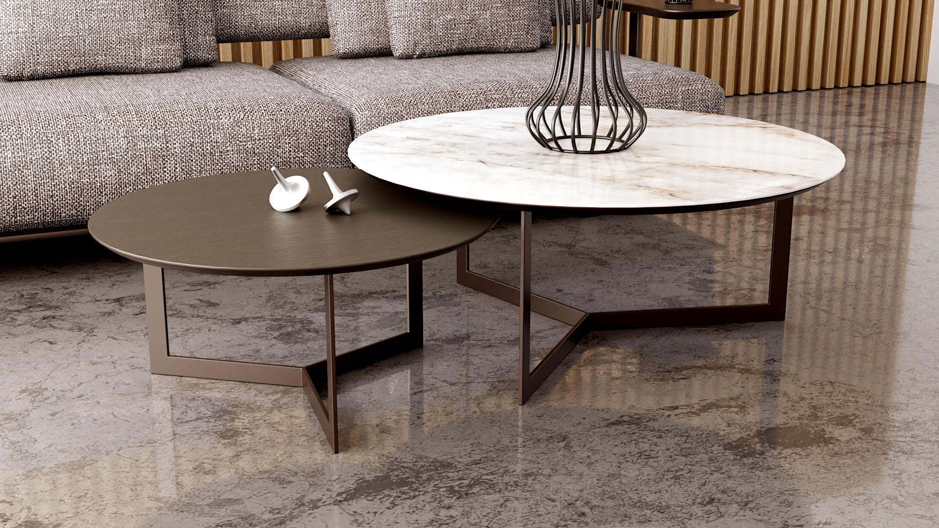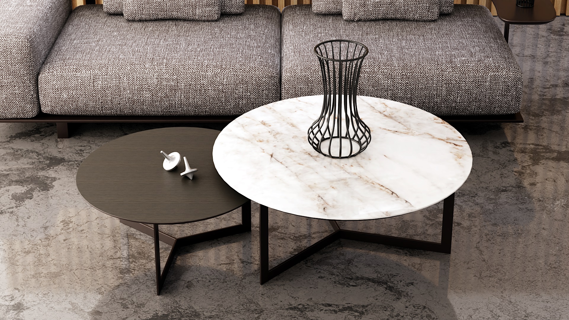 Ένα ιδιαίτερο σύνολο σε δύο αυτόνομα στρογγυλά κομμάτια διαφορετικών διαστάσεων. Με ξύλο δρυ το ένα και κεραμικό υλικό το άλλο. Οι βάσεις των τραπεζιών είναι από μέταλλο σε ανάλαφρο σχέδιο που εναρμονίζεται με κάθε στυλ διακόσμησης. Τοποθετούνται σε διάφορους συνδυασμούς για πολλές χρήσεις.